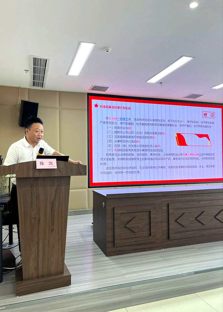 为深入推进党风廉政建设,深化党的全面领导,严明政治纪律和政治规矩,使全面从严治党走深走实,引导党员职工明纪法、守底线。2024年5月24日,自贡市自流井区人民医院党总支部书记陈凯为全体党员职工讲授了一堂以“以严明的纪律推进党的自我革命”--《中国共产党纪律处分条例》专题党课。