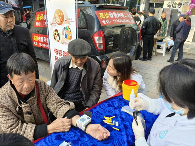 在义诊现场,党员医护人员统一佩戴党徽,亮明身份、主动服务,迅速投入到紧张有序的诊疗工作中。诊台前,医护人员耐心接待每一位前来咨询的群众,细致询问病史、测量血压血糖,针对高血压、糖尿病、关节炎等常见慢性病,逐一给出个性化诊疗建议和用药指导。