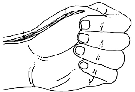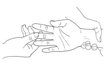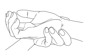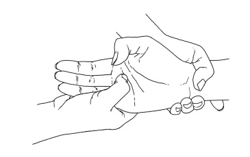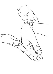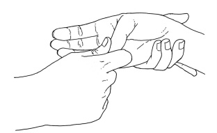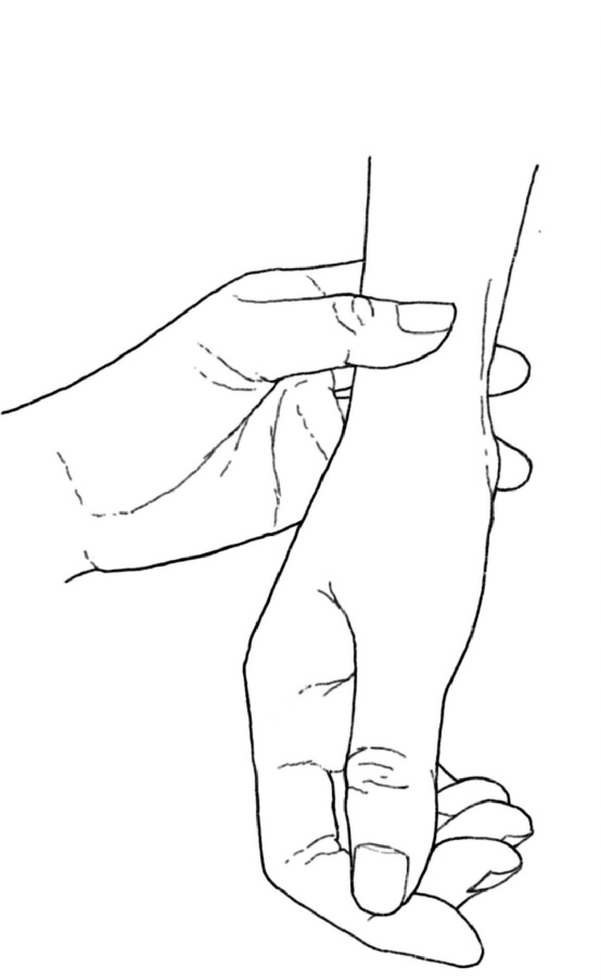 ②“下牵”:再用右手食指和拇指夹持患肢拇指,向下牵引,并向尺侧(小指侧)极度屈曲;