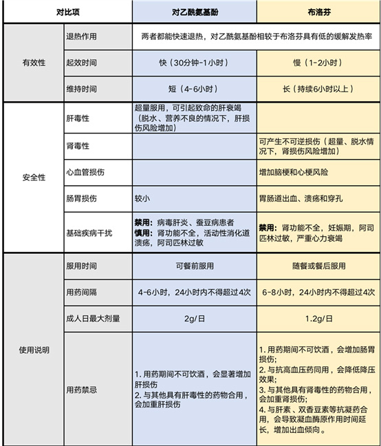 在持续高温时使用退热药,可以帮助人体快速降低体温,缓解高热及其引起的并发症(如高热惊厥等)。在本次官方发布的108种《新冠病毒感染者用药目录(第一版)》中,针对新冠感染引起发热,推荐含有布洛芬或对乙酰氨基酚的药物。为了方便患者在发热期间正确选择,将两者对比如下: