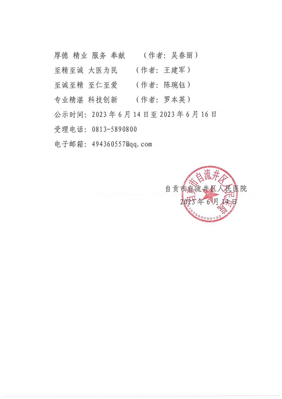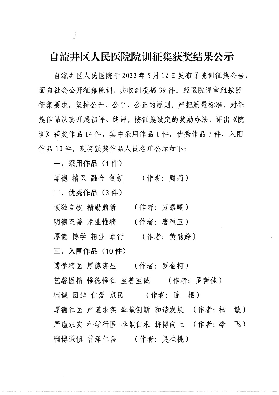 自流井区人民医院院训征集获奖结果公示