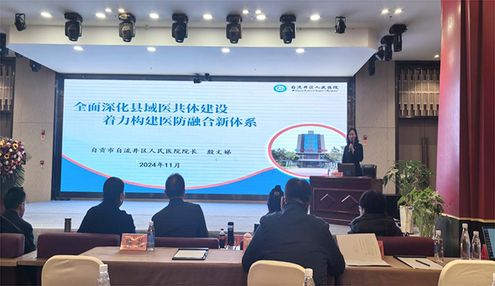 自流井区人民医院院长殷文娣在大会上以“全面深化县域医共体建设,着力构建医防融合新体系”为题,进行了精彩的交流发言。殷文娣院长从自流井区人民医院医共体的建设背景、具体举措、取得实效等三个方面进行了介绍,重点对自流井区人民医院在紧密型医共体建设和医防融合体系方面的具体做法和取得的初步成效进行了详细分享。