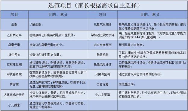 身高体重测量、内科查体、视力筛查、听力筛查、口腔检查、血常规、ALT(需空腹)。